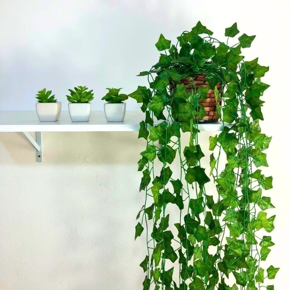 A hera artificial, também conhecida como trepadeira, é uma das folhagens mais procuradas para decoração vertical.
